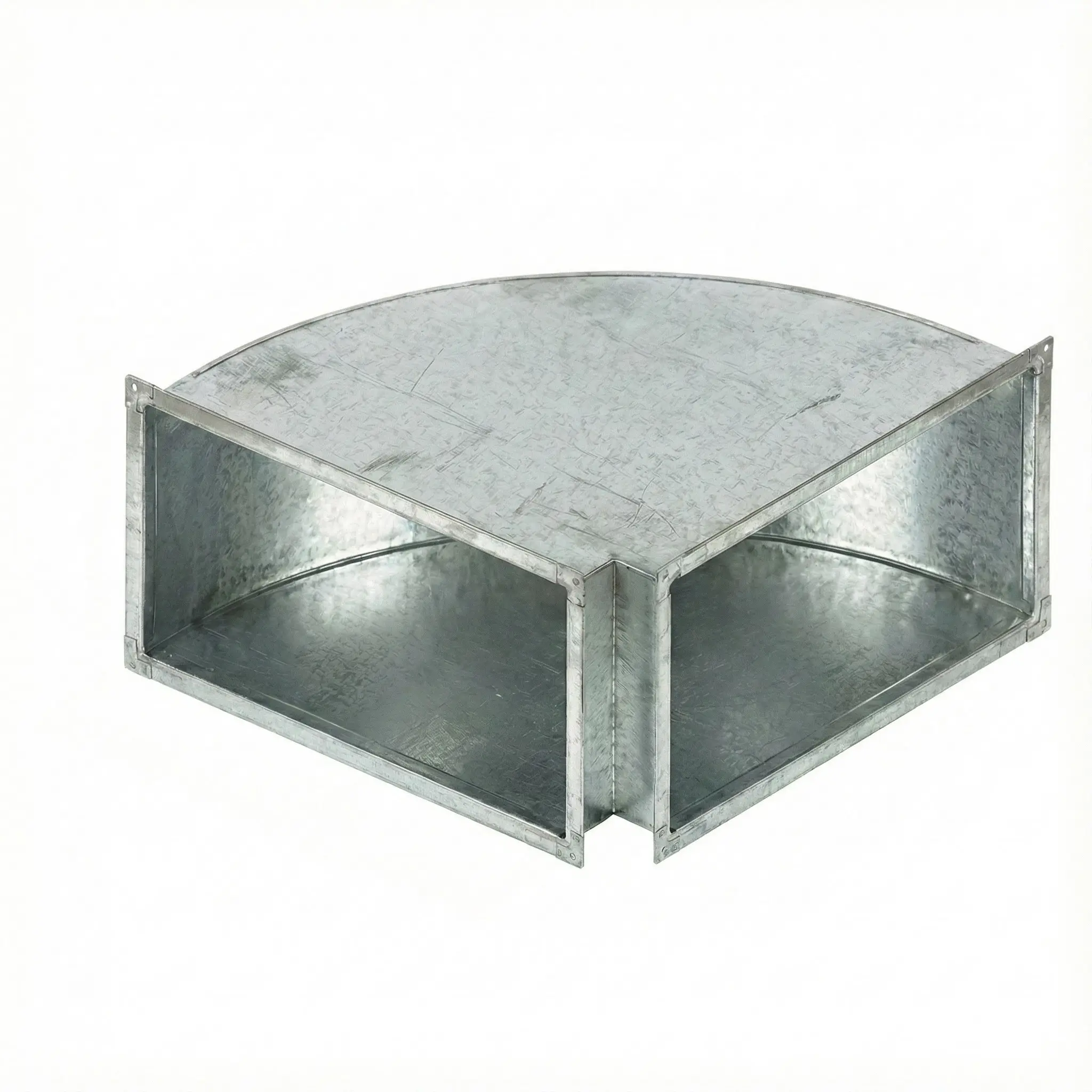 Отводы изготавливаются из оцинкованной стали по ГОСТ 14918-2020. Толщина металла подбирается в зависимости от размеров сечения и требований проекта и может составлять 0,5; 0,7; 0,9 или 1,0 мм. Конструкция прямоугольного отвода включает две боковые стенки, внутреннюю и наружную стороны. На торцах устанавливаются фланцы для болтового соединения с прямыми участками воздуховода.
